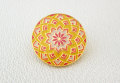 てまりの柄をあしらった、加賀てまり毬屋オリジナルのピンズです。 てまりの一番代表的な模様である「二つ菊」をモチーフにしたデザインです。 襟元や帽子、バッグのワンポイントにお使いください。 サイズ:直径22mm