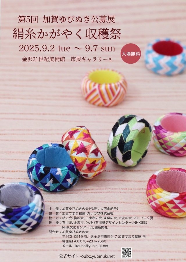 2025年9月2日~7日に金沢21世紀美術館で「第5回加賀ゆびぬき公募展 絹糸かがやく収穫祭」を開催いたします。